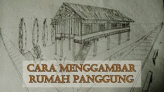 cara menggambar rumah panggung tradisional dengan metode perspektif 2 titik hilang.
