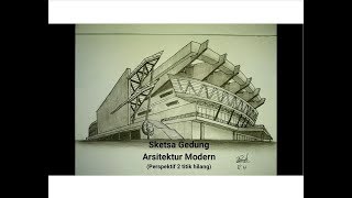 - Sketsa Gedung Arsitektur Modern (Perspektif 2 titik hilang)