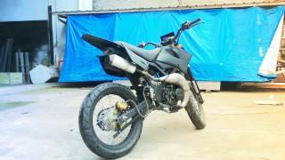 Supermoto , satria 2 tak , yang di juluki ayam titamani ini berwarna hitam dof, dengan mesin bor up 150 cc 2tak.